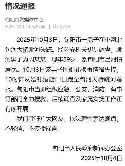 2025年10月3日,陕西旬阳市一男子在小河北旬河大桥跳河失踪。经公安机关初步调查,跳河男子为周某某,现年29岁,系旬阳市吕河镇居民。10月3日该男子因婚礼琐事情绪失控,10时许从婚礼酒店门口跑至旬河大桥跳河落水。旬阳市当即组织应急、公安、消防、海事等部门全力搜救,后续调查及家属安抚工作正有序开展。
